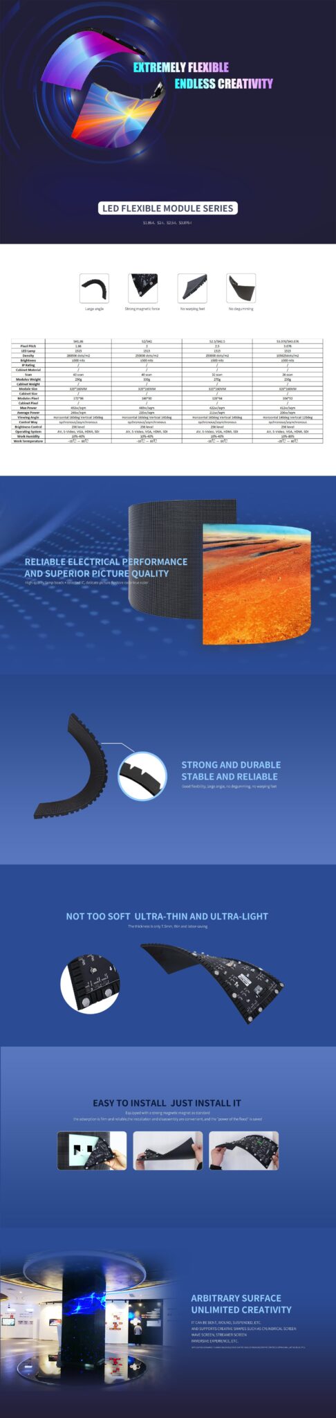 Flexible LED modules maken het mogelijk om unieke schermvormen te creëren zoals gebogen LED schermen, cilinder schermen, cirkelvormige displays en andere creatieve LED ontwerpen. Hierdoor worden ze veel gebruikt in winkelcentra, evenementen, televisiestudio’s, showrooms en architectonische projecten.
